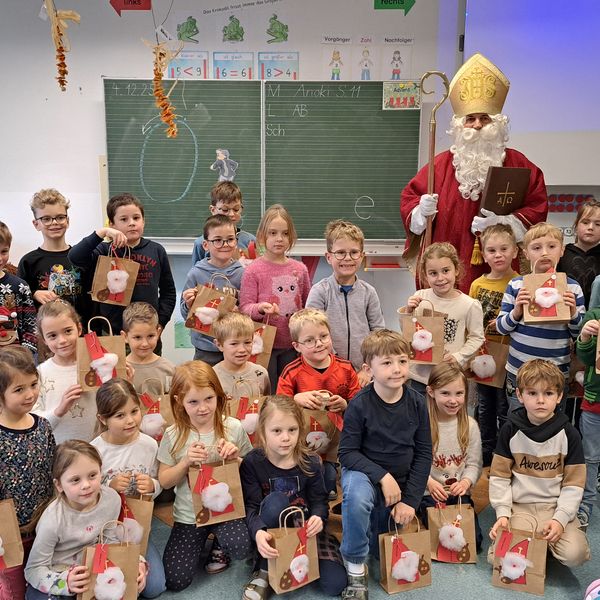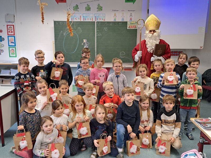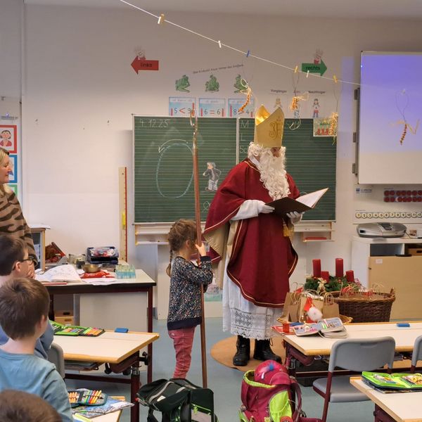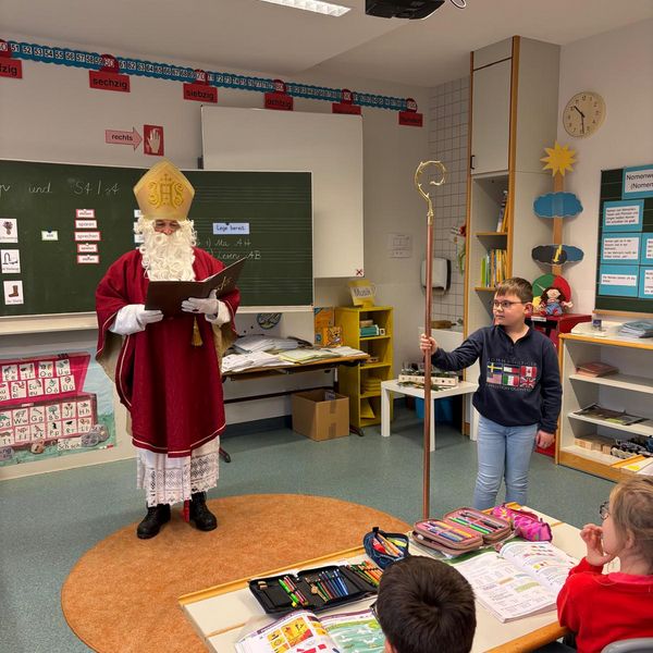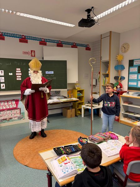 Am 5. Dezember, dem Vorabend des Nikolaustages, stattete der Heilige allen vier Klassen einen Besuch ab und beschenkte die Kinder mit Schoko-Nikoläusen. Eifrig trugen die Erst- und Zweitklässler Lieder und Gedichte für den Heiligen Mann vor. In seinem goldenen Buch war viel Positives über die Schulkinder zu lesen.